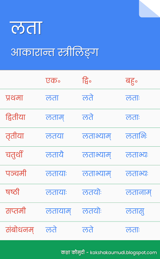 अकारान्त पुँल्लिंग शब्दों के रूपों के उदाहरण हेतु यहाँ – लता इस शब्द के रूप दिए जा रहै हैं। इसी तरह से देव शब्द को देख कर सीता, गीता, बालिका आदि शब्दों के रूप भी बानाए जा सकते हैं।